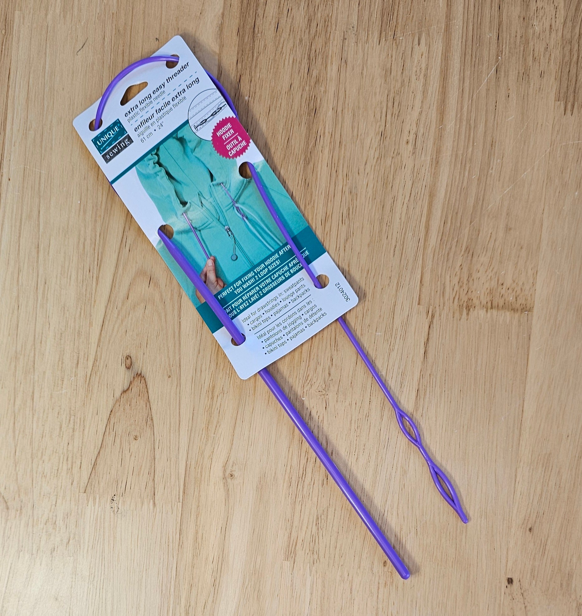 Easily replace drawstrings in garments. Just push the threader through the channel in the garment.