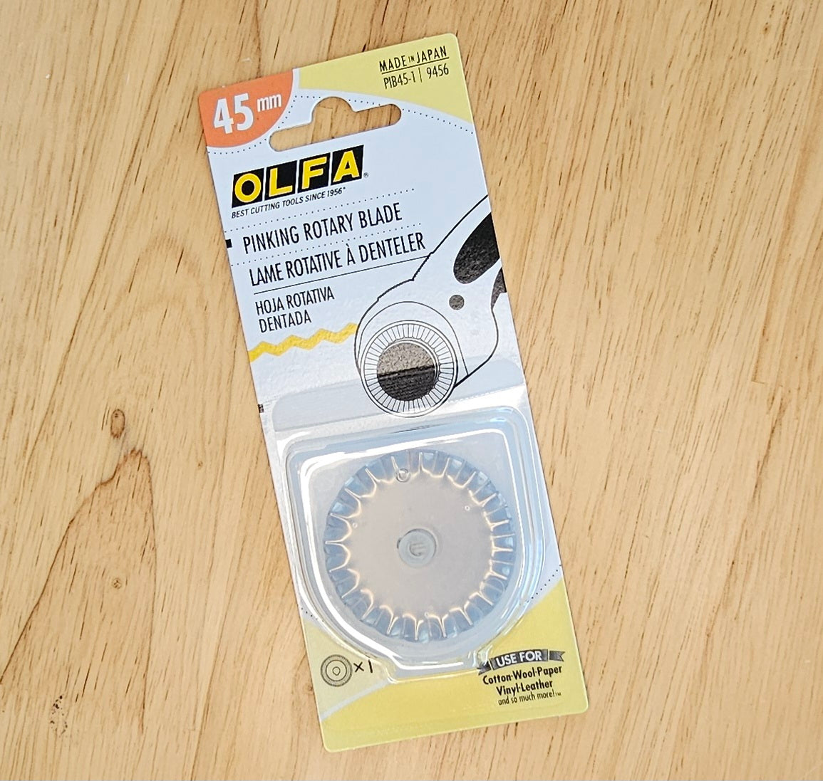 If you want to keep the edge of your fabric from raveling, you need to cut it with this pinking blade! This OLFA blade puts those familiar "teeth" on the edge of the fabric, for a look that's both decorative and functional.These blades are suitable forcutting strips and multiple layers at once. They effortlessly cut fabric, paper, tarp, vinyl, upholstery and more!