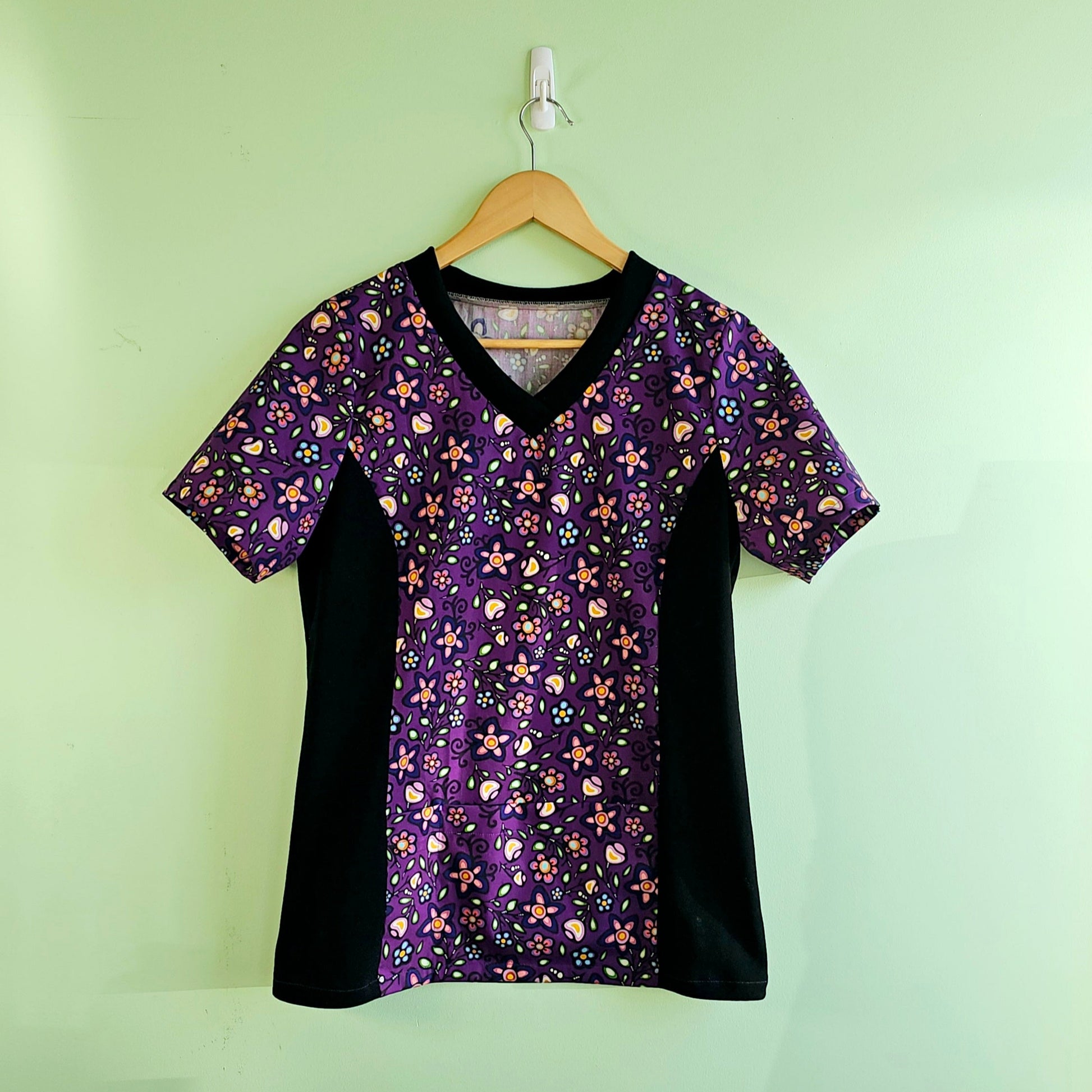Choose from any of our monarch butterfly prints, our Indigenous Artists prints or the large florals. Side panels and neckband are in black ribknit.